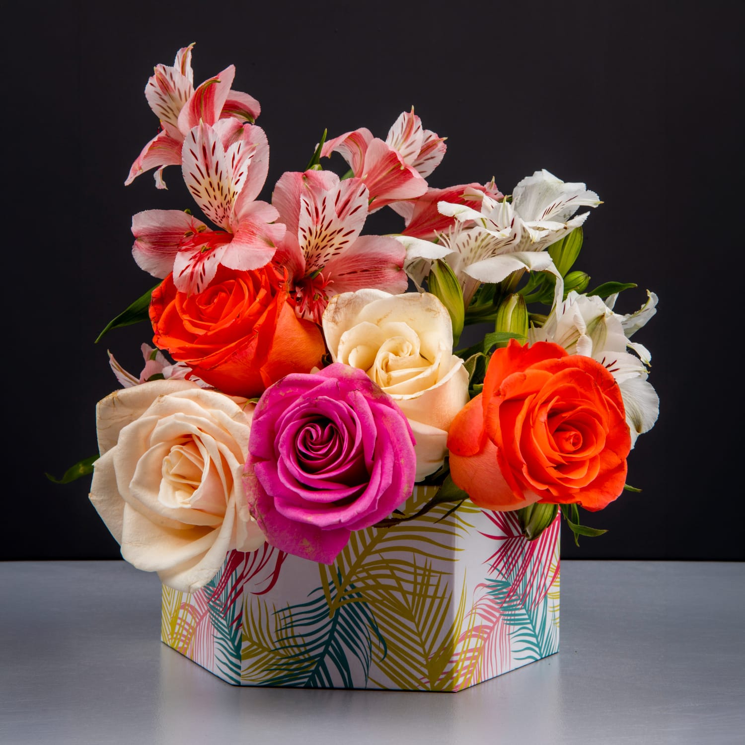 Canlı renklerin uyumuyla hazırlanmış, enerjik ve şık bir kutu aranjmanı.